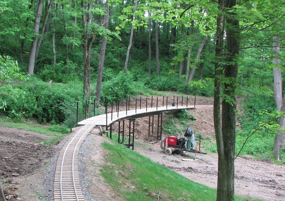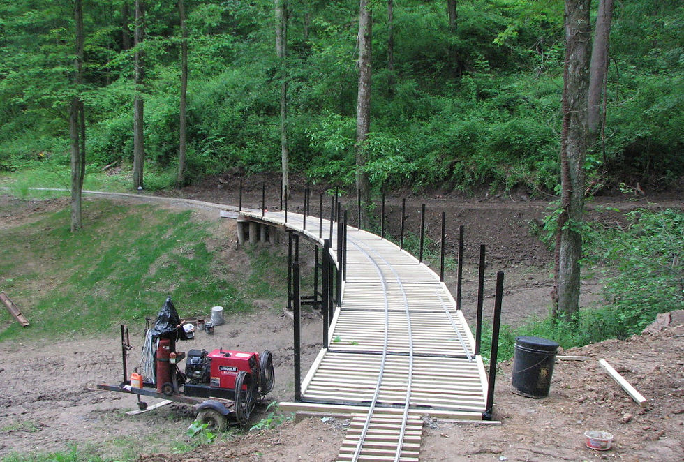 The crew has installed the bridge deck, railing posts and track. This is the view from the south end. (click thumbnail)