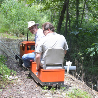 It was a beautiful weekend - sunshine and low 80s temperatures----best weekend of the summer. There were several large steam locomotives including a 2-6-6-2 Mallet. There were also quite a few smaller electric and gasoline locomotives that had good speed so as not to get in the way of the big guys. There was a lot of action on the logging line Saturday afternoon including a traffic jam at the switchbacks. The long tack on the upper switchback made a useful passing siding. Some snapshots of the meet below. The webmaster was having too much fun running his railbus to do a thorough job of documenting the activities.